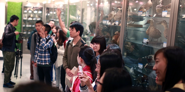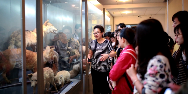 Volunteers present introductions and explanations for various items inECNU Biological Museum.