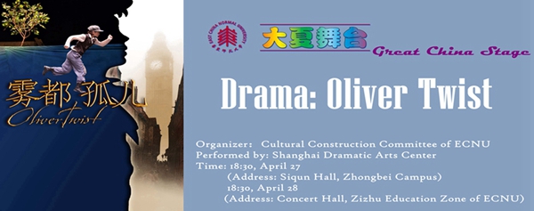 The play “Oliver Twist” performed by the Shanghai Dramatic Arts Center will be held on both campuses. ( Zhongbei Campus: April 27, Minhang Campus: April 28 ).Students or teachers willing to enjoy the drama can obtain tickets at both campuses on April 25.