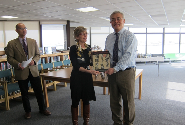The ceremony for the book donation and establishment of the Calligraphy Corner was attended by UNIS representatives including Assistant Executive Director Salvador Uy and Principal Andrew Hand, as well as Deputy Consul General Zhang Meifang and Education Consul Chang Quansheng from the Consulate General of China in New York.