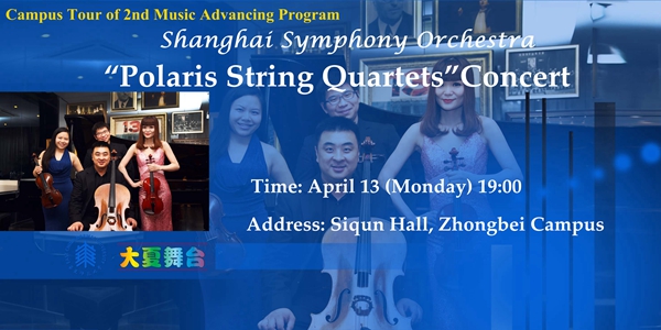 The “Polaris String Quartets” Concert is going to be held at 19:00-20:30 at Siqun Hall on the Zhongbei Campus on April 13. Students or teachers willing to attend the concert can obtain tickets at both campuses on April 9-10.