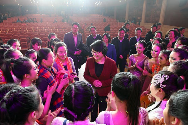 Weng Tiehui (Center), Vice Mayor of Shanghai, talks with the members of ECNU's Dance Troupe.