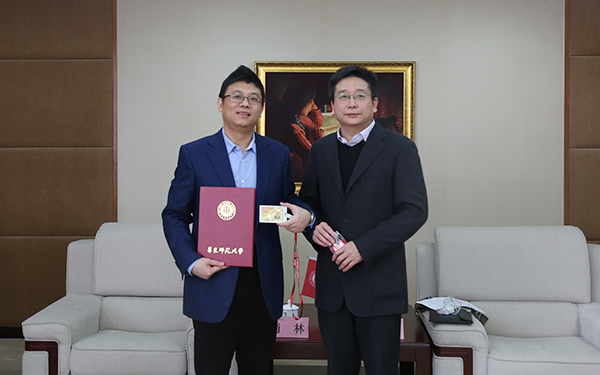 Chen Qun (Right) presents a letter of appointment as well as the university badge and card to Xiao.