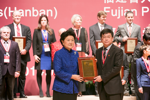 At the opening ceremony of the conference, Vice-Premier Liu Yandong, chair of the Council of Confucius Institute Headquarters, made a keynote speech and presented awards to 80 outstanding collectives and individuals. ECNU won the award for “Outstanding Confucius Institute Chinese Partner”. On behalf of the university, Chen Qun, President of ECNU, accepted the award from Madam Liu.
