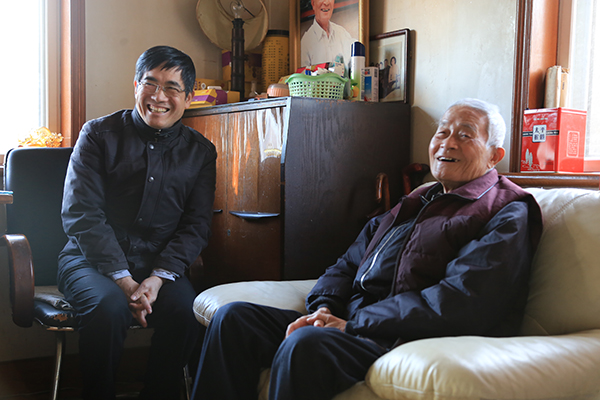 Tong Shijun (Left), Chairman of ECNU University Council, visits Xu and congratulates him for winning the award.
