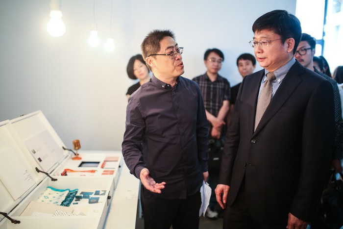 Wei Shaonong, Dean of the School of Design, introduces the exhibition to President Chen Qun.