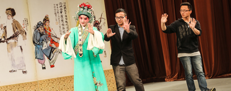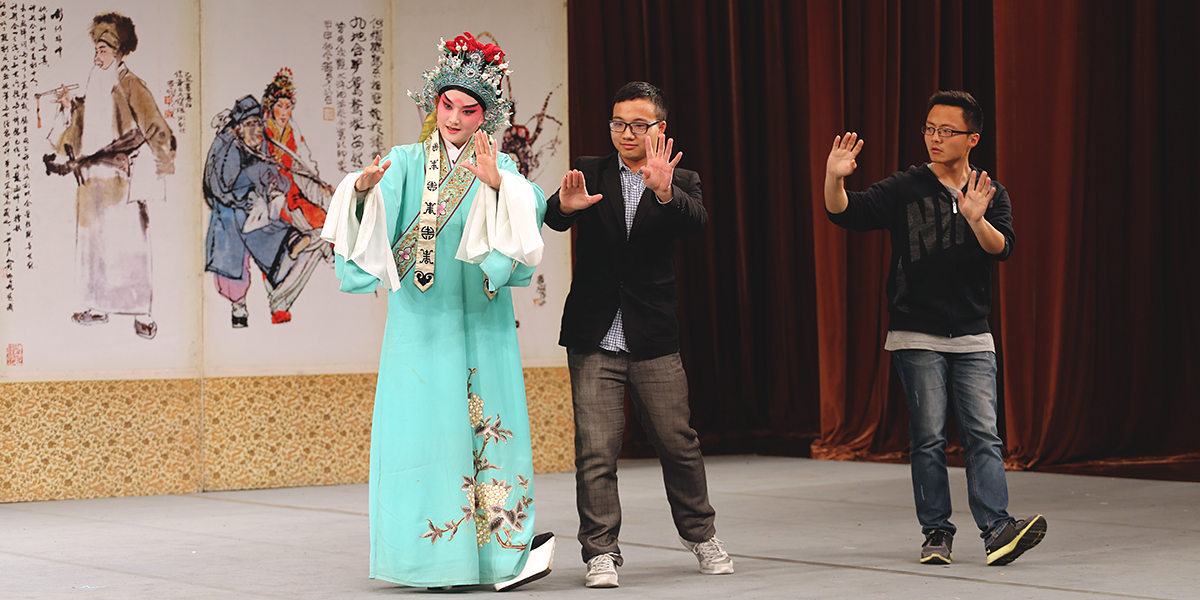 An actor teaches ECNU students baisc gestures of Kunqu Opera.
