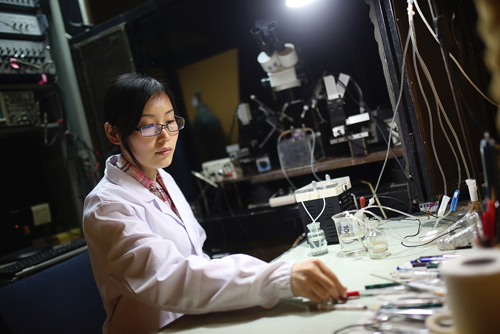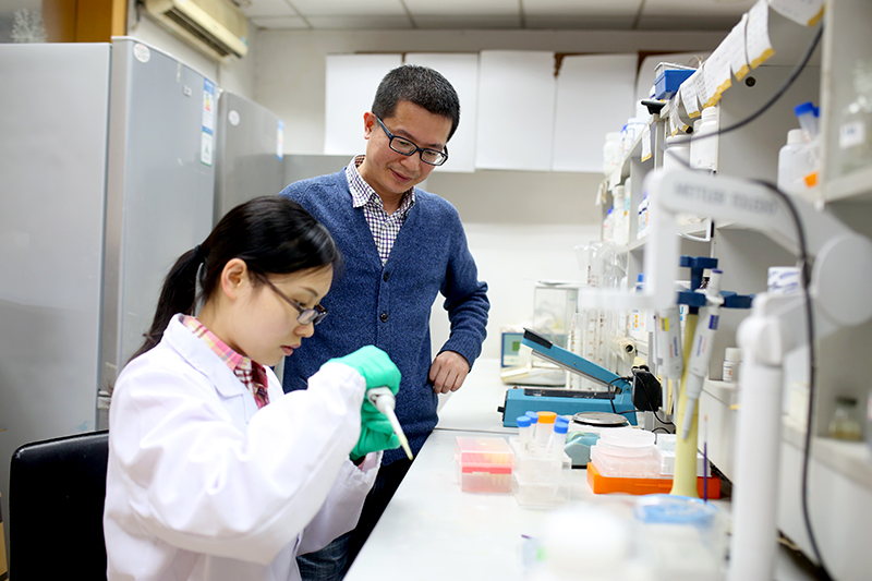 Prof. Zhou Xiaoming instructs his student in the lab.