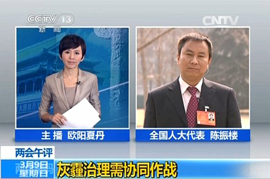 Chen Zhenlou (R) accepts an interview from CCTV.