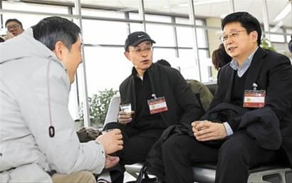 Chen Qun (R) and other CPPCC members from Shanghai exchange views on state affairs.