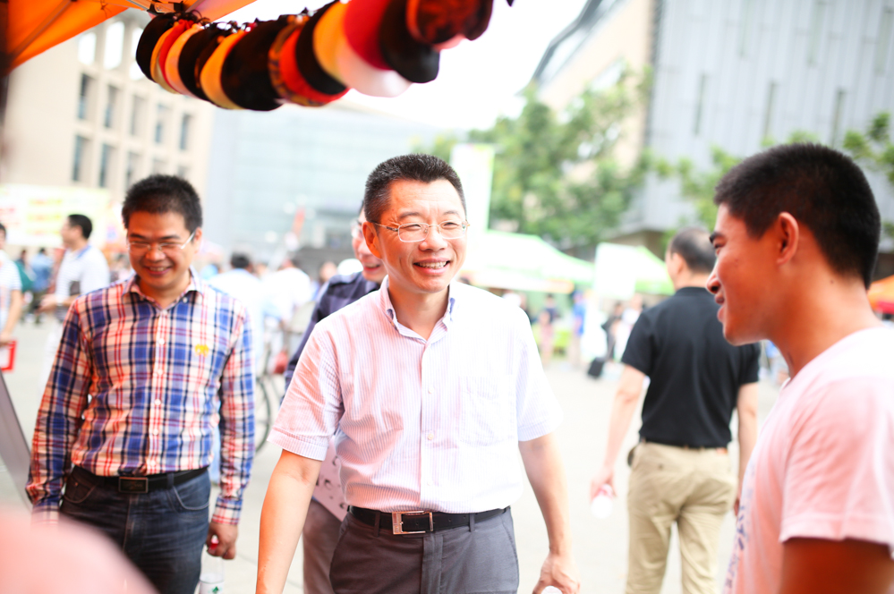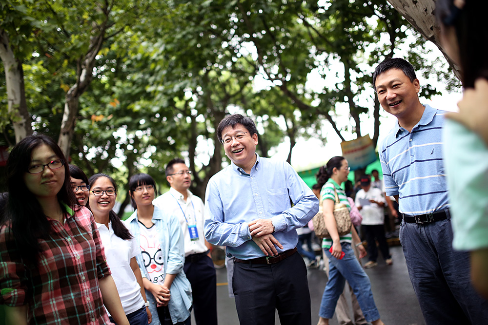 The University leaders Chen Qun (center) and Lin Zaiyong chat with new students.