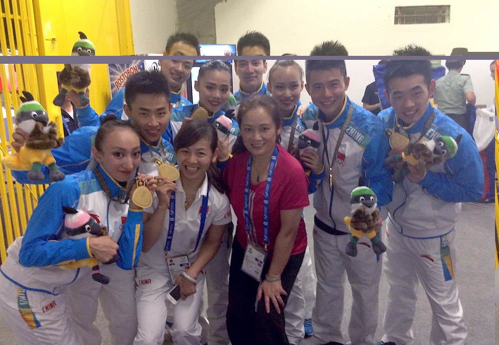 Chinese Aerobics Team members take a photo with their Chief Coach, Zhou Yan (Center).