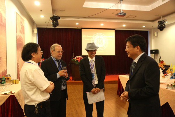 President Chen (R1), Prof. Wang Jianpan (L1), a renowned Chinese mathematician and former ECNU President, and Prof. Lin Huaxin (R2), a world leading mathematician in operator algebras, chat with Prof. Haagerup at the reception party.
