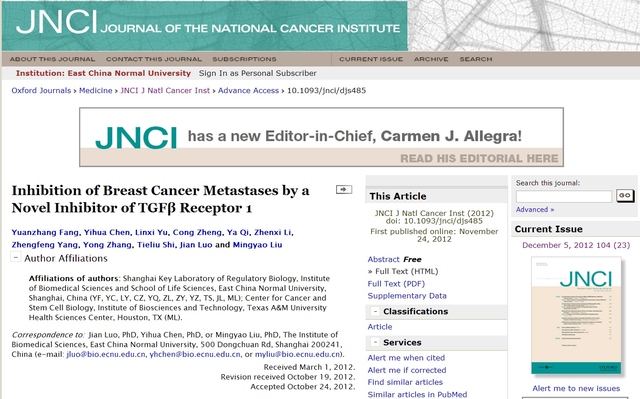 Journal of the National Cancer Institute, a world top peer-reviewed medical journal covering research in oncology, published Inhibition of Breast Cancer Metastases by a Novel Inhibitor of TGFβ Receptor 1, a research dissertation made by Prof. Liu Mingyao's team of ECNU's Institute of Biomedical Sciences.
