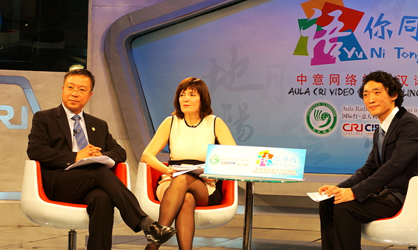 Ma Bohui (C) meets Ren Youqun and Stefania Stafutti after the broadcast program.