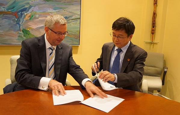 President Chen Qun signs an agreement with UBC President Stephen Toope