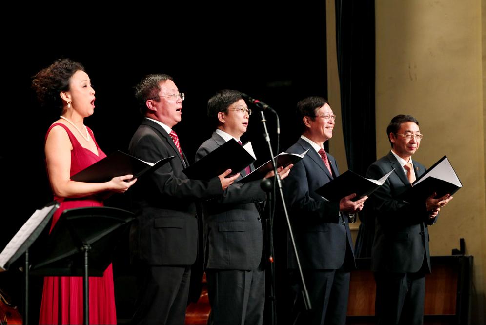 ECNU leaders Chen Qun, Ren Youqun, Fan Jun and Zhu Ziqiang sing the song "That is me" with Cao Jin. a Sprano in Germany and a professor of the Department of Music.