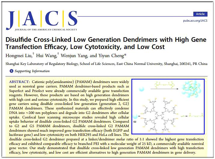 PAMAM dendrimers were widely used as nonviral gene carriers. PAMAM dendrimer-based products such as Superfect and Priofect were already commercially available gene transfection reagents. However, these products are based on high generation dendrimers with high cost and serious cytotoxicity. Prof. Cheng and his team first synthesized high efficient gene carriers using disulfide cross-linked low generation (generation 2, G2) PAMAM dendrimers. And their study demonstrated the PAMAM dendrimers has much improved gene transfection efficacy, low cytotoxicity and low cost, and can be efficient alternatives to high generation PAMAM dendrimers in gene delivery.