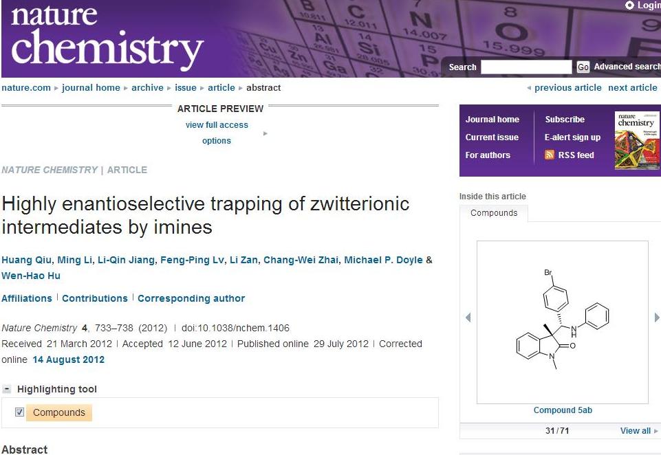 The research team published their finding in an online paper “Highly enantioselective trapping of zwitterionic intermediates by imines” on Nature Chemistry in July, 2012, and all the research work is conducted in ECNU. Nature Chemistry, a monthly scientific journal concerning chemistry, is published by Nature Publishing Group, one of the most authoritative academic publishing companies in the world.
