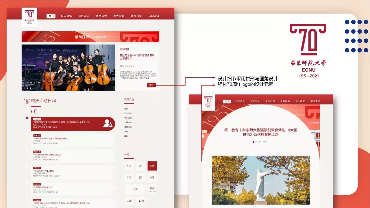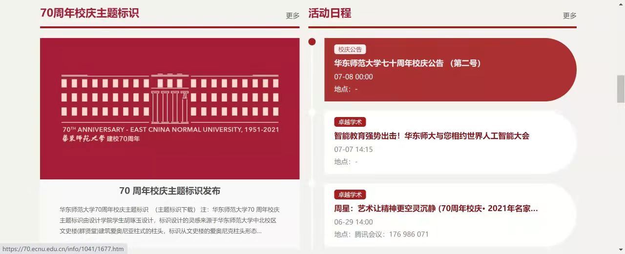 The 70th anniversary website offers many navigation menus, including the university’s news, event calendar, and some images and videos detailing key moments in the history of ECNU. Moreover, these webpages present the achievements of ECNU in the past 70 years and those wonderful celebration activities.