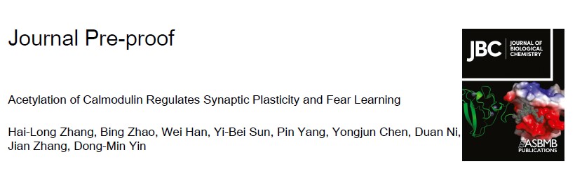 This paper entitled "Acetylation of Calmodulin Regulates Synaptic Plasticity and Fear Learning" is published on line in the Journal of Biological Chemistry. Drs Hai-Long Zhang, Bing Zhao, and PhD student Han Wei are the co-first authors of the paper, and professor Dong-Min Yin is the corresponding author of the paper. Professor Jian Zhang from Shanghai Jiaotong University provided support in the calculation of molecular dynamics.