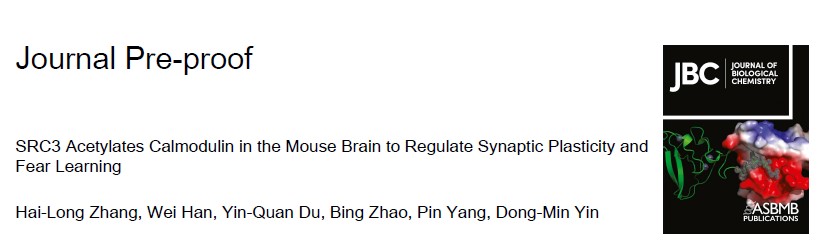 The second paper entitled "SRC3 Acetylates Calmodulin in the Mouse Brain to Regulate Synaptic Plasticity and Fear Learning", was published online in the Journal of Biological Chemistry. Dr. Hai-Long Zhang (currently a postdoctoral fellow at Soochow University), PhD student Wei Han, and master student Yin-Quan Du are the co-first authors of the paper, and professor Dong-Min Yin is the corresponding author of the paper (Figure 2). These two papers revealed the function and regulatory mechanisms of CaM acetylation, which may bring new perspectives to the study of Ca2+ signal transduction.