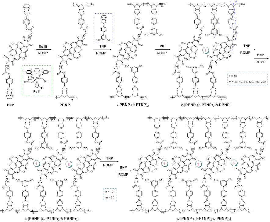 Briefly stated, the prominent feature of this technique is that the cyclization multiply happens in situ on the two ends of polymer intermediate containing living species, and the propagating ladderphane is simultaneously served as the cyclizing unit. Therefore, the developed blocking-cyclization strategy could be considered as the third route, meanwhile acting as a versatile platform to cyclic polymers by commercial Grubbs catalyst and conventional ROMP.