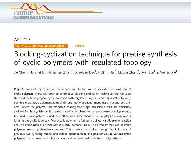 The study "Blocking-cyclization technique for precise synthesis of cyclic polymerswith regulated topology" was published in the Nature Communications on Dec. 14. It was completed independently by the ECNU team.